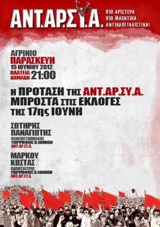 Προεκλογική εκδήλωση πραγματοποιεί η ΑΝΤ.ΑΡ.ΣΥ.Α. στο Αγρίνιο για την πρότασή της μπροστά στις εκλογές της 17ης Ιουνίου. Παρασκευή 15 Ιουνίου, ώρα 21:00 μ.μ., Πλ. Δημάδη