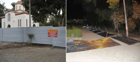 Μετά από όσα έχουν συμβεί τις τελευταίες μέρες στο πάρκο, χθες το απόγευμα τοποθετήθηκε από τον εργολάβο του έργου ένας ιδιότυπος φράκτης με μεταλλικά πετάσματα, σαν αυτόν που είχε τοποθετηθεί στην περιόδο ανακατασκευής στην κεντρική πλατεία του Αγρίνιου, ώστε να προστατευτεί το εργοτάξιο από πολίτες που τυχόν εμποδίσουν εκ νέου τα έργα ανάπλασης. Ωστόσο το βράδυ ο “φράκτης” είχε γκρεμιστεί…