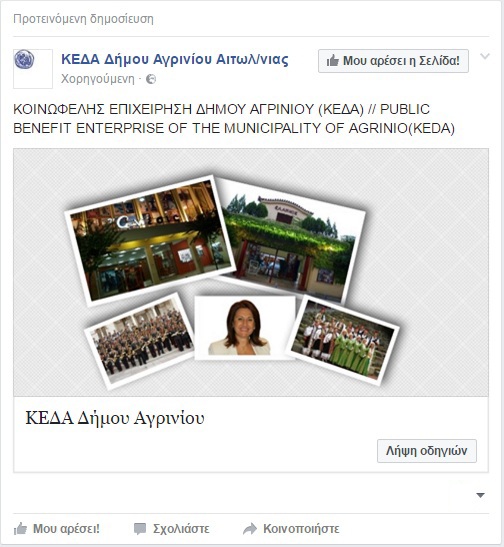Κάπως έτσι η διαφήμιση της Κοινοφελούς Επιχείρησης του Δήμου Αγρινίου στο facebook όχι μόνο μοιάζει να είναι περιττή, αλλά και έτσι όπως είναι δεν είναι διόλου ελκυστική. Πάλι καλά που στο δήμο Αγρινίου δεν μιμήθηκαν τον Κατσιφάρα που στην πρώτη του θητεία στην Περιφέρεια δαπάνησε μερικές δεκάδες χιλιάδες ευρώ από το ΕΣΠΑ για τη δημιουργία λογαρισμών στα social media (κάτι που παρέχεται δωρεάν) και έκτοκτε τα λειτουργεί ως γραφεία τύπου της Περιφερειακής Αρχής.