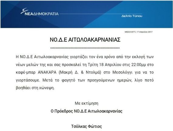 Η ΝΟ.Δ.Ε. Αιτωλοακαρνανίας γιορτάζει ένα χρόνο από την εκλογή των μελών της με την προτροπή πως “Μετά το φαγητό των προηγούμενων ημερών, λίγο ποτό βοηθάει στη χώνεψη”. Μιλάμε για φράση της επίσημης ανακοίνωσης που εστάλη στα τοπικά ΜΜΕ και όχι για κάποιο SMS προς τα γαλάζια στελέχη…