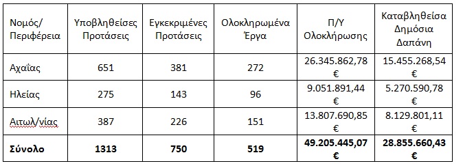 Μέσα από το ΠΕΠ Δυτικής Ελλάδας 2007-2013 που διαχειρίστηκε η Περιφέρεια Δυτικής Ελλάδας μαζί με τον ΕΦΕΠΑΕ, για τη χρηματοδότηση μικρομεσαίων επιχειρήσεων Μεταποίησης, Τουρισμού, Εμπορίου και Υπηρεσιών, συνολικά εντάχθηκαν 750 σχέδια επιχειρήσεων με συνολικό επιχορηγούμενο προϋπολογισμό 89.352.727,52 ευρώ (Δημόσια Δαπάνη 53.185.489,16 ευρώ), εκ των οποίων ολοκλήρωσαν επιτυχώς τα σχέδιά τους 519 επιχειρήσεις, συνολικού προϋπολογισμού 49.205.445,07 ευρώ (Δημόσια Δαπάνη 28.855.660,43 ευρώ).κρατικές ενισχύσεις