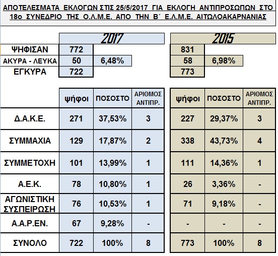 772 εκπαιδευτικοί μέλη της Β΄ΕΛΜΕ Αιτωλοακαρνανίας προσήλθαν στις κάλπες για να ψηφίσουν για αντιπροσώπους στο 18ο συνέδριο της ΟΛΜΕ. Αξιοσημείωτη άνοδος της ΔΑΚΕ (προσκ.ΝΔ) και θεαματική πτώση της ΣΥΜΜΑΧΙΑΣ (προσκ. ΣΥΡΙΖΑ) κατεγράφησαν στις χθεσινές (25/05) εκλογές στη Β΄ΕΛΜΕ Αιτ/νίας για αντιπροσώπους στο επικείμενο 18ο Συνέδριο της ΟΛΜΕ. Σαφώς ευνοημένα τα αριστερά σχήματα ΑΕΚ και ΑΑΡΕΝ, όχι όμως και η ΑΓΩΝΙΣΤΙΚΗ ΣΥΣΠΕΙΡΩΣΗ (προσκ.ΚΚΕ).