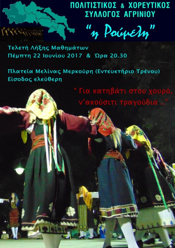 Ο Πολιτιστικός & Χορευτικός Σύλλογος Αγρινίου “Η Ρούμελη” θα πραγματοποιήσει την Τελετή Λήξης Μαθημάτων του την Πέμπτη 22 Ιουνίου 2017 & Ώρα 20.30 στην Πλατεία Μελίνας Μερκούρη (Εντευκτήριο Τρένου). Θα παρουσιάσουμε χορούς απο τη Ρούμελη, Ήπειρο, Κρήτη, Σάμο, Ικαρία, Ρόδο, Φλώρινα, Αριδαία και Ανατολική Ρωμυλία!!!