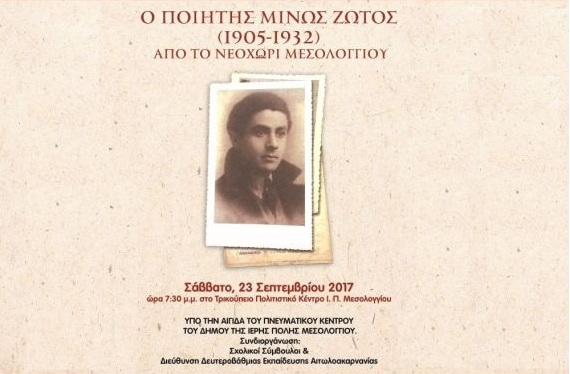 Υπό την αιγίδα του Πνευματικού Κέντρου του Δήμου Ιερής Πόλης Μεσολογγίου πραγματοποιείται το Σάββατο 23 Σεπτεμβρίου και ώρα 20.00 στο χώρο του Τρικούπειου Πολιτιστικού Κέντρου, εκδήλωση με θέμα «Ο ποιητής Μίνως Ζώτος (1905-1932) από το Νεοχώρι Μεσολογγίου».