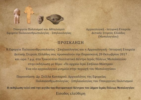 Η Εφορεία Παλαιοανθρωπολογίας-Σπηλαιολογίας και η Αρχαιολογική-Ιστορική εταιρεία Δυτικής Ελλάδας προσκαλούν την Παρασκευή 20 Οκτωβρίου 2017 και ώρα 7 μ.μ. στο Τρικούπειο Πολιτιστικό Κέντρο Ιεράς Πόλεως Μεσολογγίου, στην εκδήλωση με θέμα «Το αρχαίο Ιερό Σπήλαιο Μάστρου. Ένα νέο αρχαιολογικό μνημείο στην περιοχή του Μεσολογγίου».
