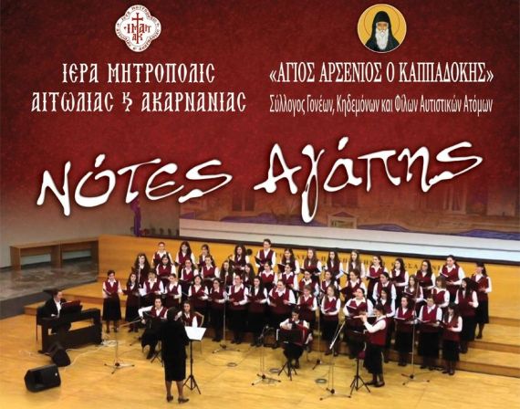 Η ΙΕΡΑ ΜΗΤΡΟΠΟΛΙΣ ΑΙΤΩΛΙΑΣ & ΑΚΑΡΝΑΝΙΑΣ και ο Σύλλογος Γονέων, Κηδεμόνων και Φίλων Αυτιστικών Ατόμων «ΑΓΙΟΣ ΑΡΣΕΝΙΟΣ Ο ΚΑΠΠΑΔΟΚΗΣ» σας προσκαλούν σε Μουσική Συναυλία με τη Νεανική Φοιτητική Χορωδία της Ορθόδοξης Χριστιανικής Αδελφότητας «Χριστιανική Ελπίς» το Σάββατο 25 Νοεμβρίου 2017, ώρα 6.30 μ.μ. στην Αίθουσα εκδηλώσεων Νομαρχιακού Μεγάρου Ι.Π.Μεσολογγίου.