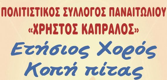 Ο Πολιτιστικός Σύλλογος Παναιτωλίου «Χρήστος Καπράλος» σας προσκαλεί στον Ετήσιο Χορό – Κοπή πίτας, την Παρασκευή 19 Ιανουαρίου 2018, στο Studio Πιθάρι στο Γιαννούζι. Θα μας τιμήσει ιδιαίτερα η παρουσία σας!