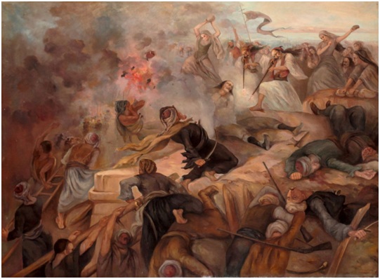 • Δεν είναι μια συνηθισμένη εικόνα μάχης. Δείχνει τον αγώνα μιας πόλης και των κατοίκων της να αμύνεται σε έναν ολόκληρο τακτικό στρατό. Άντρες και γυναίκες αντιστέκονται με όχι απαραίτητα πολεμικό υλικό, ακόμη και πέτρες ενάντια στον πολιορκητή προκειμένου να διαφυλάξουν την ελευθερία τους