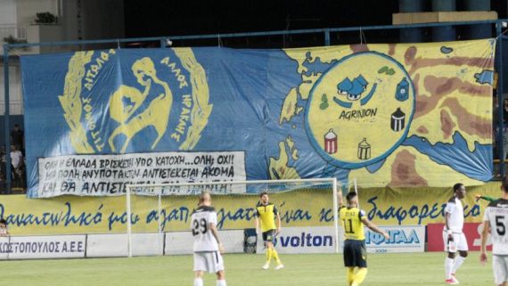 Με ένα μεγάλο πανό που άπλωσαν στο πέταλο των οργανωμένων παρομοιάζουν το Αγρίνιο με μια πόλη που αντιστέκεται στο… κόκκινο, το κίτρινομαυρο, το ασπρόμαυρο και την ΕΠΟ! Συγκεκριμένα το πανό γράφει: «ΟΛΗ Η ΕΛΛΑΔΑ ΒΡΙΣΚΕΤΑΙ ΥΠΟ ΚΑΤΟΧΗ… ΟΛΗ; ΟΧΙ! ΜΙΑ ΠΟΛΗ ΑΝΥΠΟΤΑΚΤΩΝ ΑΝΤΙΣΤΕΚΕΤΑΙ ΑΚΟΜΑ ΚΑΙ ΘΑ ΑΝΤΙΣΤΕΚΕΤΑΙ ΓΙΑ ΠΑΝΤΑ!».