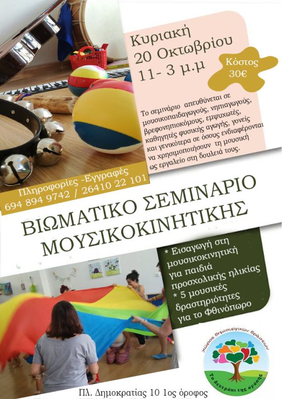 Ο χώρος δημιουργικών δράσεων “Το δεντράκι της αγάπης” και η μουσικοπαιδαγωγός Μελίνα Χονδρού πραγματοποιούν σεμινάριο μουσικοκινητικής την ΚΥΡΙΑΚΗ 21/10 ΚΑΙ ΩΡΑ 10:00-14:00