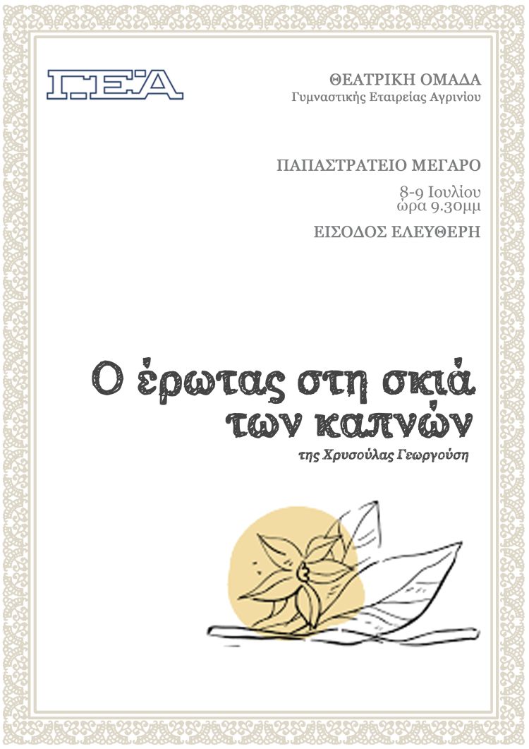 Πρόκειται για το έργο της Χρυσούλας Γεωργούση «Ο έρωτας στη σκιά των καπνών», σε σκηνοθεσία της Γιούλης Μαρούση. Η είσοδος θα είναι ελεύθερη.