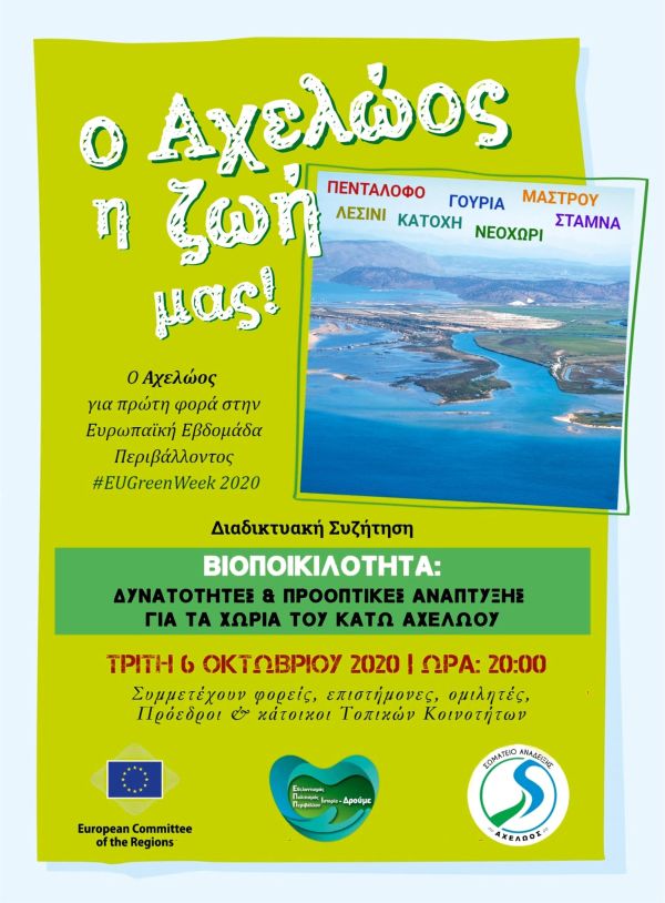Ο Αχελώος συμμετέχει στη μεγαλύτερη περιβαλλοντική διοργάνωση της Ευρώπης, καθώς με απόφαση της Ευρωπαϊκής Επιτροπής θα πραγματοποιηθεί, για πρώτη φορά και στο Μεσολόγγι – χωριά του Κάτω Αχελώου, η Ευρωπαϊκή Εβδομάδα Περιβάλλοντος #EUGreenWeek2020 στις 6 Οκτωβρίου.