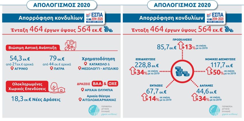 Αυξήσαμε την απορρόφηση του ΕΣΠΑ εντάσσοντας έργα που βελτιώνουν την καθημερινότητα και ενισχύουν την πραγματική οικονομία. Αυτό είναι το μήνυμα που συνοδεύει ένα από τα γραφικά του απολογισμού του για το 2020, που ανήρτησε στα social media o Περιφερειάρχης Δυτικής Ελλάδας Νεκτάριος Φαρμάκης.