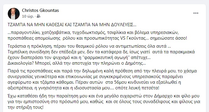Αυτό που παρατήρησαν πολλοί όμως είναι ότι παρά το γεγονός ότι στο μήνυμα της παραίτησής του μίλησε με «σκληρούς όρους» κάνοντας αναφορά σε παραγοντιλίκια, τσιφλίκια και βόλεμα υπηρεσιακών, που ενδεχομένως να δείχνουν και την οργή του για ορισμένα από τα τεκταινόμενα στο δήμο Αγρινίου, μια οργή όμως που ο Χρ. Γκούντας πότε δεν την εξωτερίκευσε και δεν την έκανε πολιτικό «πρόβλημα» για τη Δημοτική Αρχή.