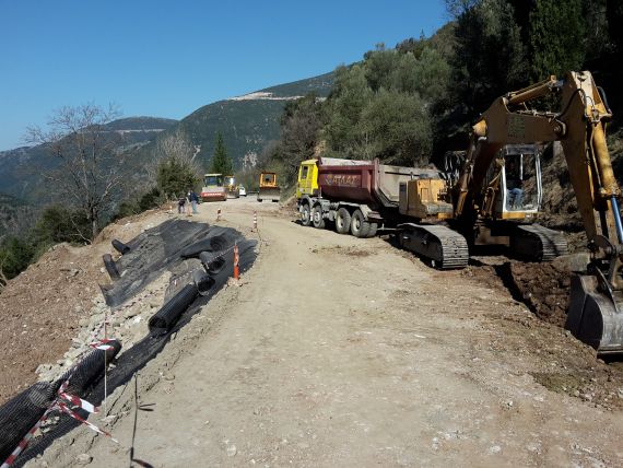 Κατασκευή τεχνικών έργων, όπως τοίχων αντιστήριξης πρανών από σκυρόδεμα και συρματοκιβώτια για την προστασία του δρόμου από καταπτώσεις κλπ.