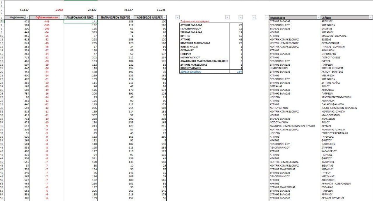 Στο σχετικό πίνακα λοιπόν φιγουράρουν αρκετά τμήματα από την περιοχή της Δυτικής Ελλάδας και της Αιτωλοακαρνανίας. Όμως πρώτο στη λίστα εμφανίζεται εκλογικό τμήμα στο Αγρίνιο με διαφορά, σύμφωνα με το σχετικό πίνακα, φηφοδελτίων σε σχέση με τους διαπιστευμένους κατά 445. Ενώ στην πλειονότητα των τμημάτων οι διαφορές είναι μονοψήφιες…