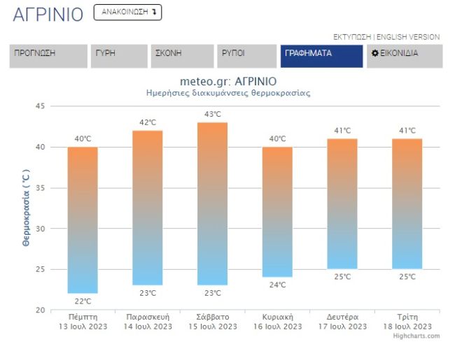 Στους 38,6 βαθμούς έφτασε σήμερα Πέμπτη η θερμοκρασία στη μέγιστη τιμή της στο Αγρίνιο σύμφωνα με τα στοιχεία που κατέγραψε ο μετεωρολογικός σταθμός που είναι εγκατεστημένος στο κτίριο του Πανεπιστημίου στο Αγρίνιο. Ωστόσο ο δείκτης δυσφορίας, σε συνδυασμό δηλαδή με την υγρασία και άλλα μετεωρολογικά δεδομένα, έφτασε του 42°C, πράγμα που σημαίνει ότι ανεξάρτητα από το που σταμάτησε ο υδράργυρος να ανεβαίνει, οι συνθήκες που διαμορφώνονται είναι αυτές του έντονου καύσωνα.