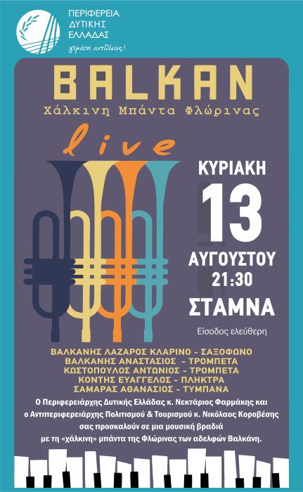 Ο Περιφερειάρχης Δυτικής Ελλάδας Νεκτάριος Φαρμάκης και ο Αντιπεριφερειάρχης Πολιτισμού και Τουρισμού Νικόλαος Κοροβέσης, προσκαλούν το κοινό σε μια ιδιαίτερη μουσική βραδιά με τη Χάλκινη Μπάντα της Φλώρινας των Αδελφών Βαλκάνη, η οποία θα πραγματοποιηθεί την Κυριακή 13 Αυγούστου 2023 στην Κοινότητα Σταμνάς του Δήμου της Ι.Π. Μεσολογγίου, στις 21.30, στο χώρο της πλατείας, με ελεύθερη είσοδο για τους πολίτες.