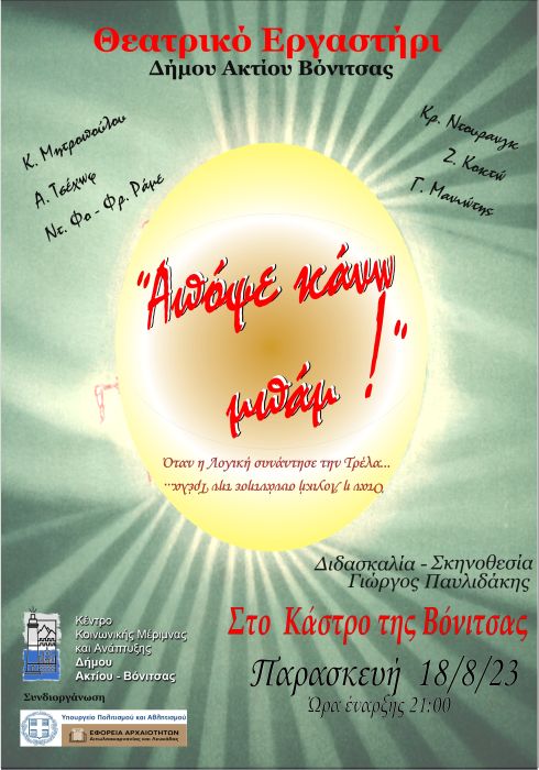 Με ιδιαίτερη χαρά ανακοινώνουμε την παράσταση εφαρμογής του Θεατρικού Εργαστηρίου του Δήμου Ακτίου Βόνιτσας. Κατά την διάρκεια της χρονιάς που διανύσαμε μέχρι και σήμερα οι εκπαιδευόμενοι στο εργαστήριο διδάχθηκαν βασικές αρχές της θεατρικής τέχνης με ιδιαίτερη έμφαση στην εκφορά του λόγου την υποκριτική, αυτοσχεδιασμό, κινησιολογία και αγωγή του λόγου.