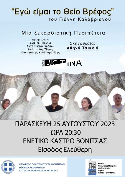 Την Παρασκευή 25 Αυγούστου 2023 στις 20.30 στο Κάστρο της Βόνιτσας σας καλούμε να παρακολουθήσετε την θεατρική παράσταση από το θέατρο ACTINA την ξεκαρδιστική περιπέτεια «ΕΓΩ ΕΙΜΑΙ ΤΟ ΘΕΙΟ ΒΡΕΦΟΣ».
