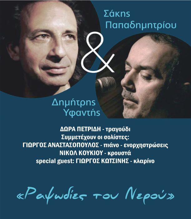 Ο συνθέτης Σάκης Παπαδημητρίου συμπράττει με τον διακεκριμένο ερμηνευτή και τραγουδοποιό Δημήτρη Υφαντή σε μια μουσική παράσταση που έχει στόχο να συνδυάσει ένα σημαντικό στοιχείο του φυσικού μας κόσμου που βρίσκεται στο επίκεντρο της κλιματικής αλλαγής με την άυλη πολιτιστική μας κληρονομιά. Το στοιχείο αυτό είναι το νερό που εκτός από το ότι αποτελεί και το κυριότερο συστατικό της ίδιας της φυσικής μας υπόστασης είναι αυτό που έχει περισσότερο συνδεθεί και σε επίπεδο διαβίωσης, αλλά και συμβολισμού στον χώρο της φιλοσοφίας της θρησκείας και της τέχνης με την ιστορία του ανθρώπινου πολιτισμού.