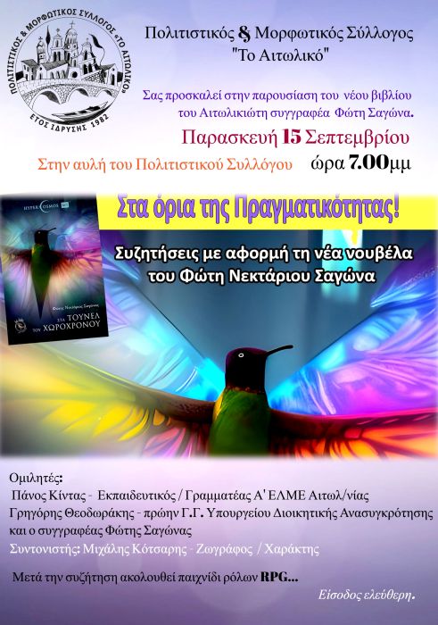 Ο Πολιτιστικός & Μορφωτικός Σύλλογος “Το Αιτωλικό” προσκαλεί στην παρουσίαση του νέου βιβλίου του Αιτωλικιώτη συγγραφέα Φώτη Σαγώνα, την Παρασκευή 15 Σεπτεμβρίου και ώρα 7.00μμ, στην αυλή του Συλλόγου!