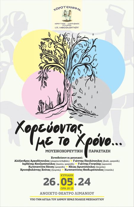 Ο Δήμος Ιερής Πόλης Μεσολογγίου και ο Χορευτικός-Λαογραφικός Σύλλογος Ι.Π. Μεσολογγίου «Χοροτέχνημα» σας προσκαλούν στην μουσικοχορευτική παράσταση «Χορεύοντας με το Χρόνο…», την Κυριακή, 26 Μαΐου 2024, στις 20:15 στο Ανοιχτό Θέατρο Λιμανιού στο Μεσολόγγι.