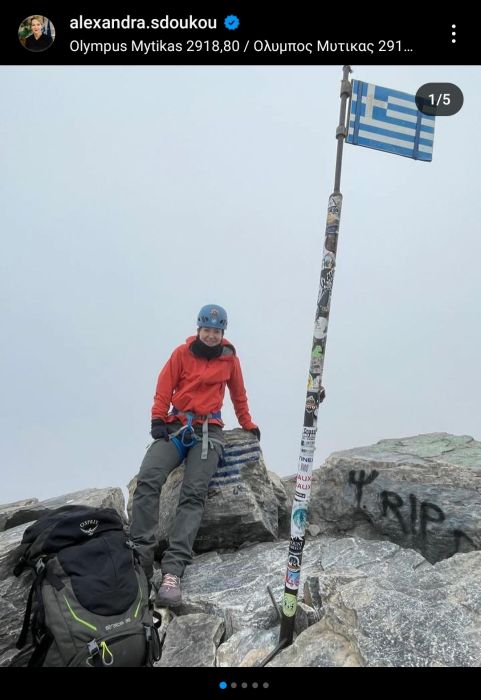 Πραγματοποίησε ανάβαση στην κορυφή του Ολύμπου στα 2.919 μέτρα. «Νιώθεις διάφορα συναισθήματα στο δρόμο για την κορυφή του Ολύμπου. Χαίρεσαι με την απόφαση του εγχειρήματος, αμφισβητείς τις δυνατότητες του εαυτού σου, λαχανιάζεις στις ατελείωτες ανηφόρες, φοβάσαι σκαρφαλώνοντας δίπλα σε χάσματα, αλλά τελικά σε σπρώχνει η δύναμη του μυαλού και της ψυχής μέχρι τα 2919 μέτρα» ανέφερε σε ανάρτησή της στο προσωπικό της λογαριασμό στο Instagram περιγράφοντας τα συναισθήματά της από την περιπέτειά της.