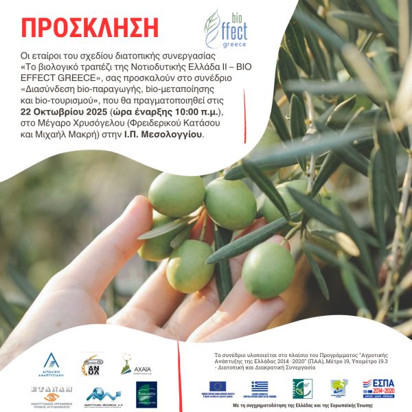 Οι εταίροι του σχεδίου διατοπικής συνεργασίας «Το βιολογικό τραπέζι της Νοτιοδυτικής Ελλάδα ΙΙ – ΒΙΟ EFFECT GREECE» σας προσκαλούν στο συνέδριο «Διασύνδεση biο-παραγωγής, biο-μεταποίησης και bio-τουρισμού, που θα πραγματοποιηθεί στις 22 Οκτωβρίου 2025 στις 10:00 π.μ., στο Μέγαρο Χρυσογέλου (Φρειδερίκου Κατάσου και Μιχαήλ Μακρή) στο Μεσολόγγι.