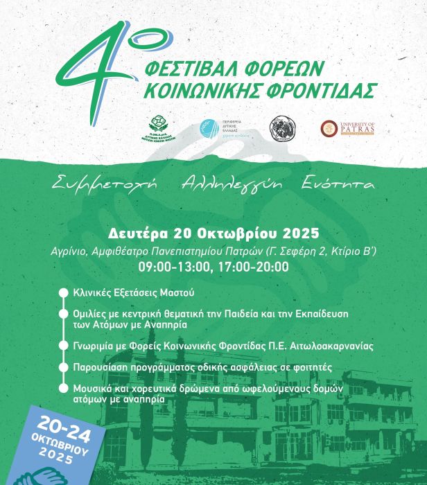 Με πρώτο σταθμό το Αγρίνιο, στο κτίριο Β’ του Πανεπιστημίου Πατρών (Γ. Σεφέρη 2) ξεκινά τη Δευτέρα 20 Οκτωβρίου 2025 το 4ο Φεστιβάλ Φορέων Κοινωνικής Φροντίδας της Περιφερειακής Ομοσπονδίας Ατόμων με Αναπηρία Δυτικής Ελλάδας και Νοτίων Ιονίων Νήσων. Ένα Φεστιβάλ που πραγματοποιείται με στόχο την ενημέρωση, τη συνεργασία και την ευαισθητοποίηση της κοινωνίας γύρω από ζητήματα αναπηρίας και κοινωνικής φροντίδας.