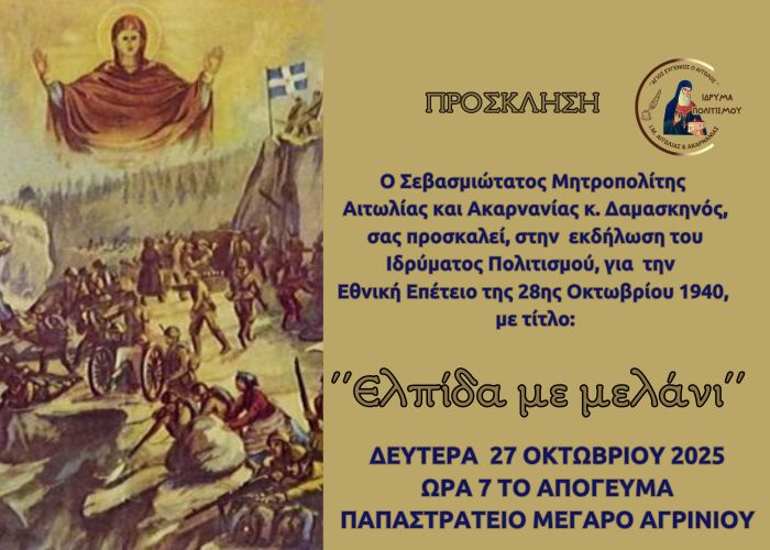 Η Ιερά Μητρόπολη Αιτωλίας και Ακαρνανίας και το Ίδρυμα Πολιτισμού “Άγιος Ευγένιος ο Αιτωλός” τιμώντας την ένδοξη εποποιία του 1940, διοργανώνουν επετειακή εκδήλωση με τίτλο: «Ελπίδα με μελάνι».