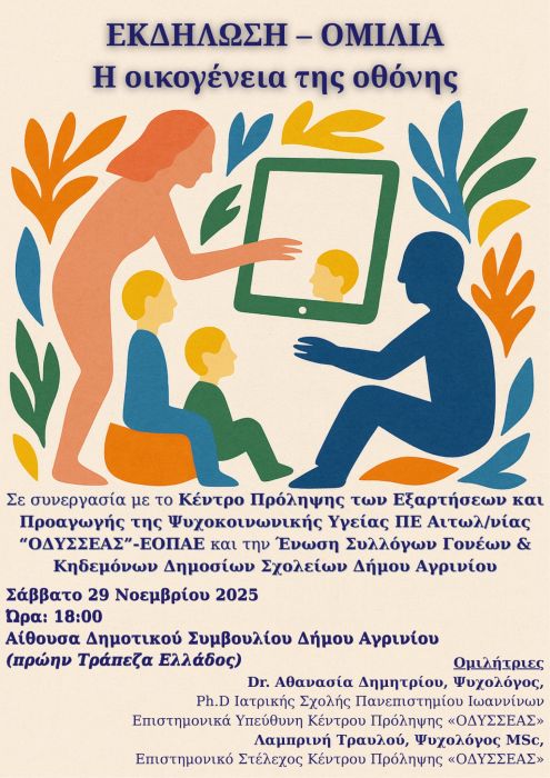 Η Ένωση Συλλόγων Γονέων & Κηδεμόνων Δημοσίων Σχολείων Δήμου Αγρινίου, σε συνεργασία με το Κέντρο Πρόληψης των Εξαρτήσεων και Προαγωγής της Ψυχοκοινωνικής Υγείας Π.Ε. Αιτωλ/νίας « ΟΔΥΣΣΕΑΣ» – ΕΟΠΑΕ, σας προσκαλεί στην ενημερωτική εκδήλωση: «Η οικογένεια της οθόνης»