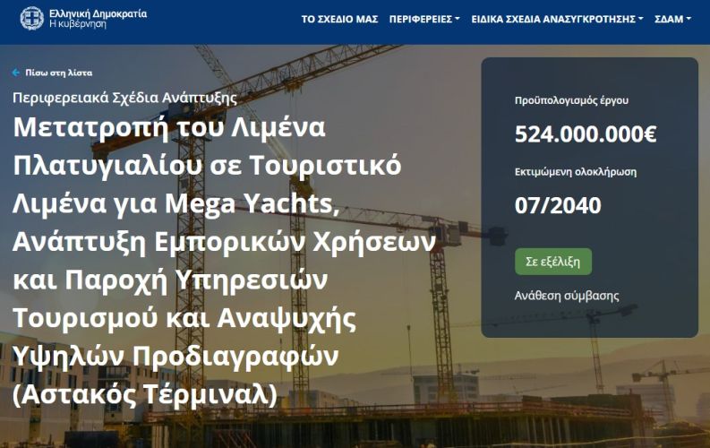 Έχει ιδιαίτερο ενδιαφέρον το γεγονός ότι η κυβερνητική πλατφόρμα των έργων ανά την Ελλάδα, το erga.gov.gr, έχει συμπεριλάβει πλέον και το «Nautilus project», που αφορά τη μετατροπή του λιμανιού στο Πλατυγιάλι του Αστακού σε μαρίνα για mega yachts.