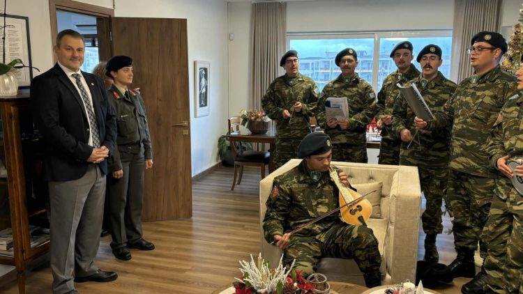 Αμέσως μετά ακολούθησε χορωδία δέκα στρατιωτών του 2/39 Συντάγματος Ευζώνων Μεσολογγίου, συνοδευόμενων από την Ανθυπολοχαγό Πεζικού κα Αγγελική Μπακή. Με κρητική λύρα και βαρύτονο, τα κάλαντα ακούστηκαν με έναν διαφορετικό ήχο, που κέρδισε το ενδιαφέρον και το χειροκρότημα όσων βρέθηκαν στο Δημαρχείο.