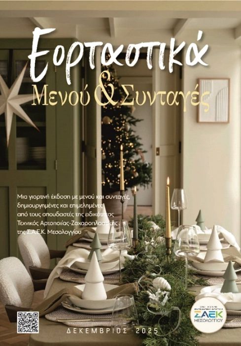 Η Σχολή Ανώτερης Επαγγελματικής Κατάρτισης (Σ.Α.Ε.Κ.) Μεσολογγίου παρουσιάζει με ιδιαίτερη χαρά το νέο γιορτινό φυλλάδιο “Εορταστικά Μενού & Συνταγές”, μια καλαίσθητη και εμπνευσμένη έκδοση που δημιουργήθηκε από τους σπουδαστές της ειδικότητας Τεχνικός Αρτοποιίας-Ζαχαροπλαστικής, στο πλαίσιο εργασίας εξαμήνου.