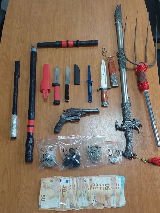 Οι αστυνομικοί κατέσχεσαν 1 περίστροφο, 1 ξίφος, μαχαίρια, 50 περίπου γραμμάρια κάνναβης και 1.760 ευρώ