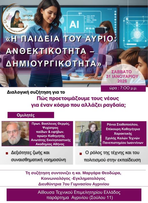 Σας προσκαλούμε σε μια διαλογική συζήτηση με θέμα: «Η Παιδεία του Αύριο: Ανθεκτικότητα – Δημιουργικότητα», η οποία θα πραγματοποιηθεί το Σάββατο 31 Ιανουαρίου 2026, στις 19:00’, στην αίθουσα εκδηλώσεων του Τεχνικού Επιμελητηρίου Αιτωλοακαρνανίας (Πάνου Σούλου 11, 1ος όροφος).