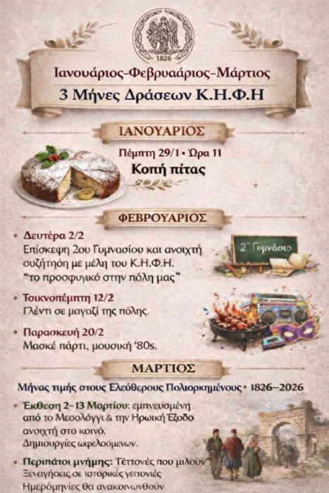 Το Κέντρο Ημερήσιας Φροντίδας Ηλικιωμένων (Κ.Η.Φ.Η.) του Δήμου Ιεράς Πόλεως Μεσολογγίου υλοποιεί τρίμηνο πρόγραμμα δράσεων για τους μήνες Ιανουάριο, Φεβρουάριο και Μάρτιο 2026, με κοινωνικές, πολιτιστικές και επετειακές δραστηριότητες.