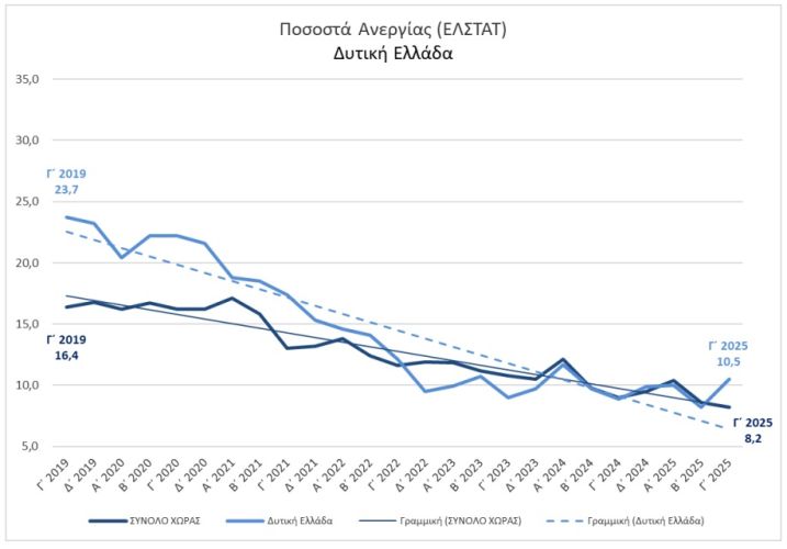 Οι αυξητικές τάσεις όμως της ανεργίας στη Δυτική Ελλάδα, επιβεβαιώνονται κυρίως συγκρίνοντας τα στοιχεία του 2025 και του 2024. Είναι χαρακτηριστικό ότι στο γ’ τρίμηνο του 2025, που σημειωτέον μιλάμε για το τρίμηνο της high season στο τουρισμό και παραδοσιακά σημειώνεται μείωση της ανεργίας, στη Δυτική Ελλάδα καταγράφηκε αύξηση κατά 1,6 ποσοστιαίες μονάδες (στο 10,5% από το 8,9%).