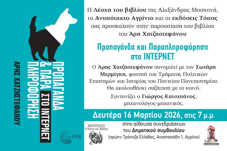 Η Λέσχη του βιβλίου της Αλεξάνδρας Μοσχονά, το Ανυπότακτο Αγρίνιο και οι εκδόσεις Τόπος σας προσκαλούν στην παρουσίαση του βιβλίου του Άρη Χατζηστεφάνου