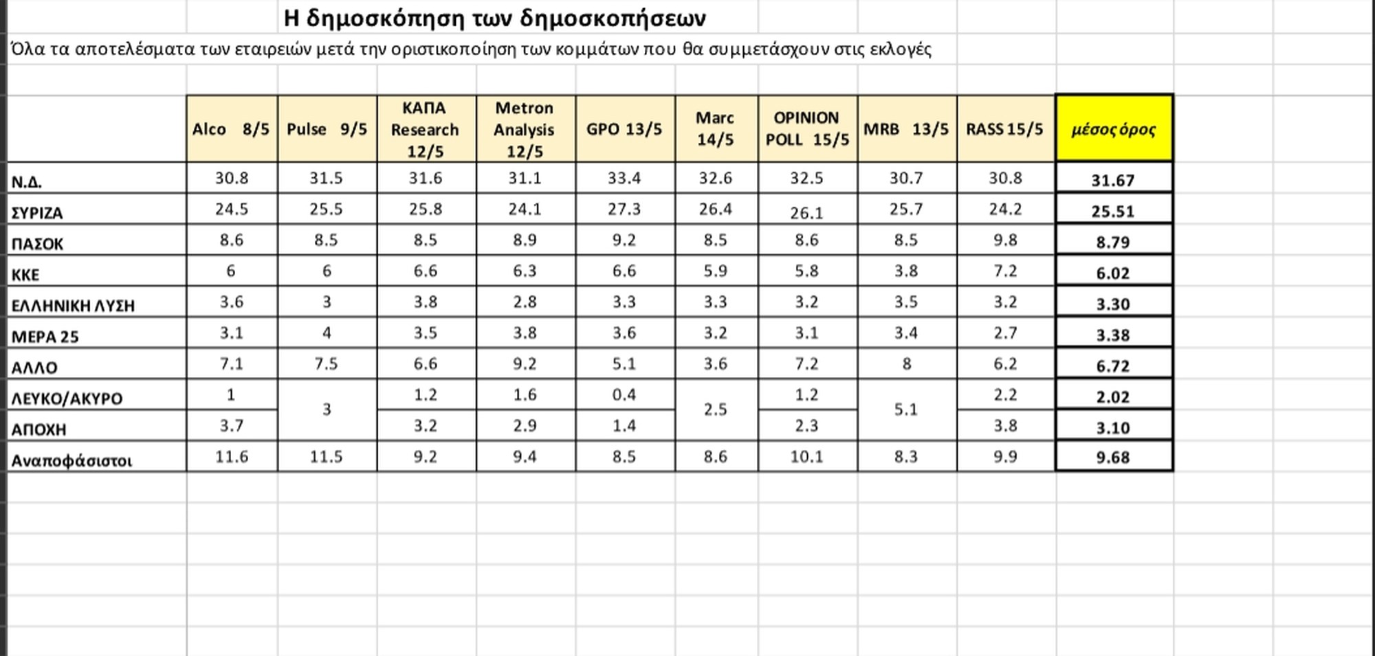 Πάντως οι περισσότεροι αναλυτές εκτιμούν ότι η ψήφος των αναποφάσιστων, θα κατανεμηθεί λίγο ή πολύ αναλογικά και δεν θα επηρεάσει σημαντικά την δύναμη του ενός ή του άλλου κόμματος. Η δημοσκόπηση των δημοσκοπήσεων βασίστηκε στα ευρήματα που προκύπτουν από τις έρευνες των εταιρειών Alco, Pulse, Kapa Research, Metron Analysis, GPO, Marc, Opinion Poll, MRB και Rass. Επελέγησαν δηλαδή μόνο οι εταιρείες που μετέχουν στον ΣΕΔΕΑ, ενώ ορισμένες εταιρείες επειδή έκαναν περισσότερες της μίας έρευνες, επελέγη τελικά η πιο πρόσφατη.